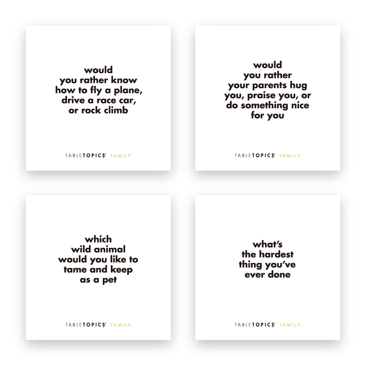 Creative Child Magazine Preferred Choice Award Winner This award-winning conversation starter edition is a must-have for anyone looking for an easy way to engage their family in great conversation. It contains a fun mix of questions ranging from silly to thought-provoking. They are perfect for mealtime, bedtime, or anytime in between.