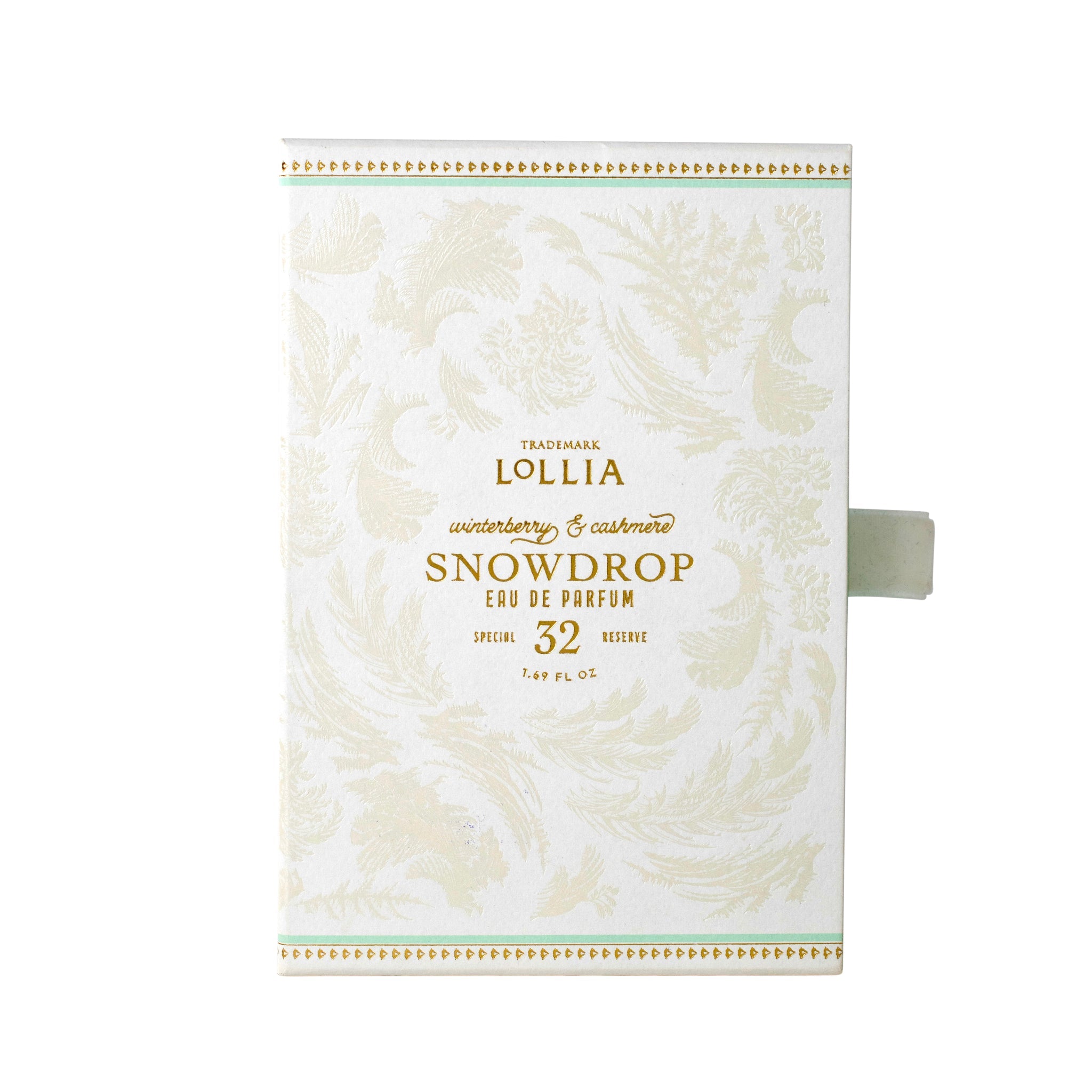 Lollia Snowdrop Eau de Parfum captures the serene beauty of a delicate frost at dawn with a refined blend of Winterberry, White Woods, Bergamot, Camellia, and soft Cashmere.