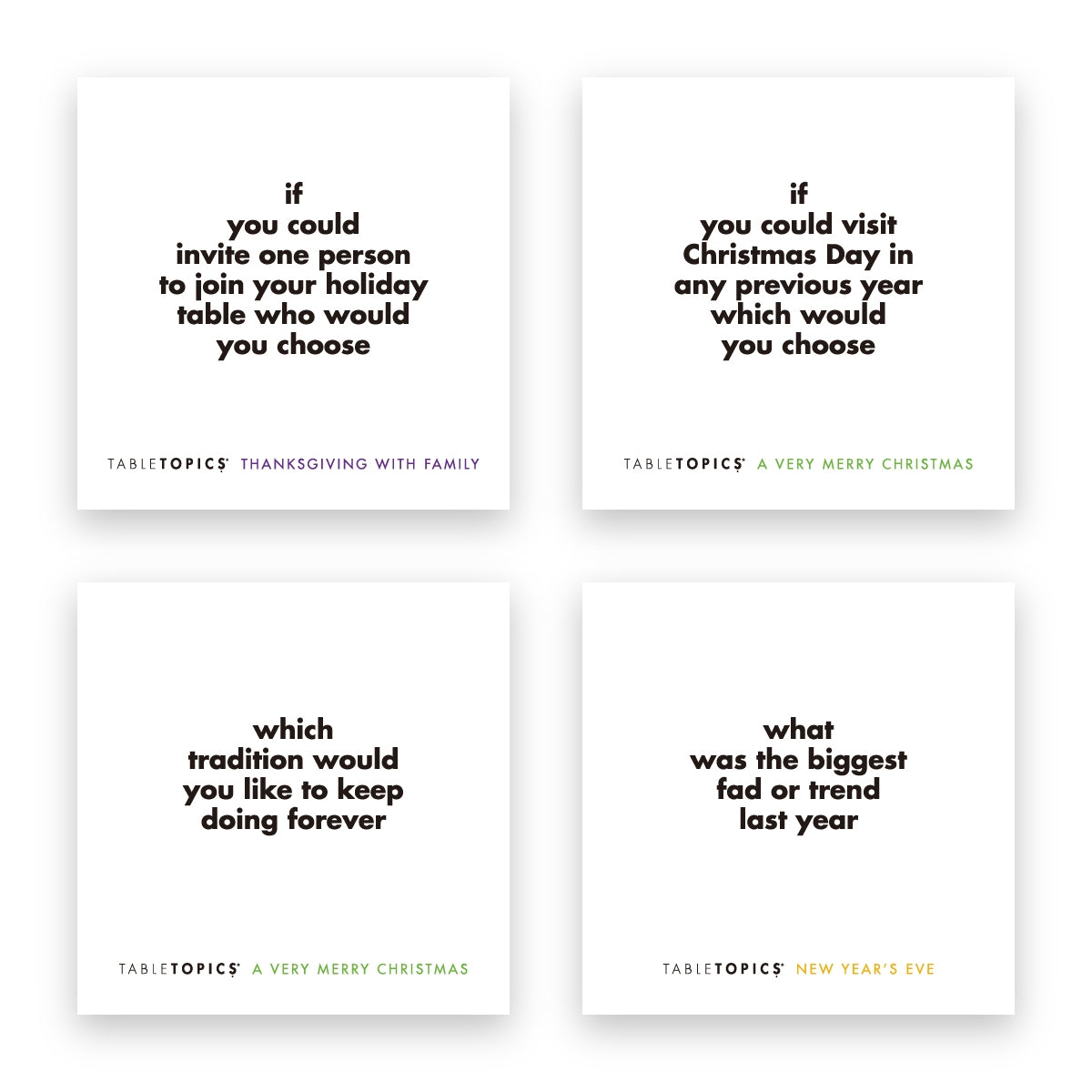 These festive questions will add sparkle to your holiday table and bring your family and friends together in new ways. Discover, reflect, reminisce, and share laughter through the season and beyond.