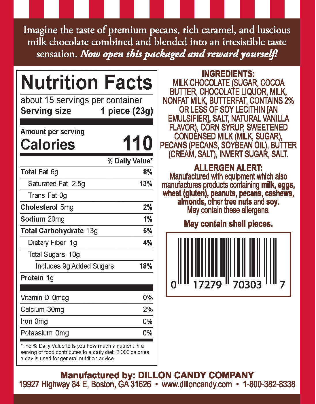 Featuring the signature combination of roasted pecan pieces, caramel, and rich milk chocolate, these clusters provide a satisfying and indulgent snacking experience.