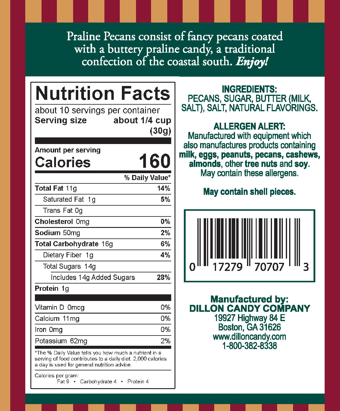 Praline pecans consist of fancy pecans coated with a buttery, praline candy, a traditional confection of the coastal South.