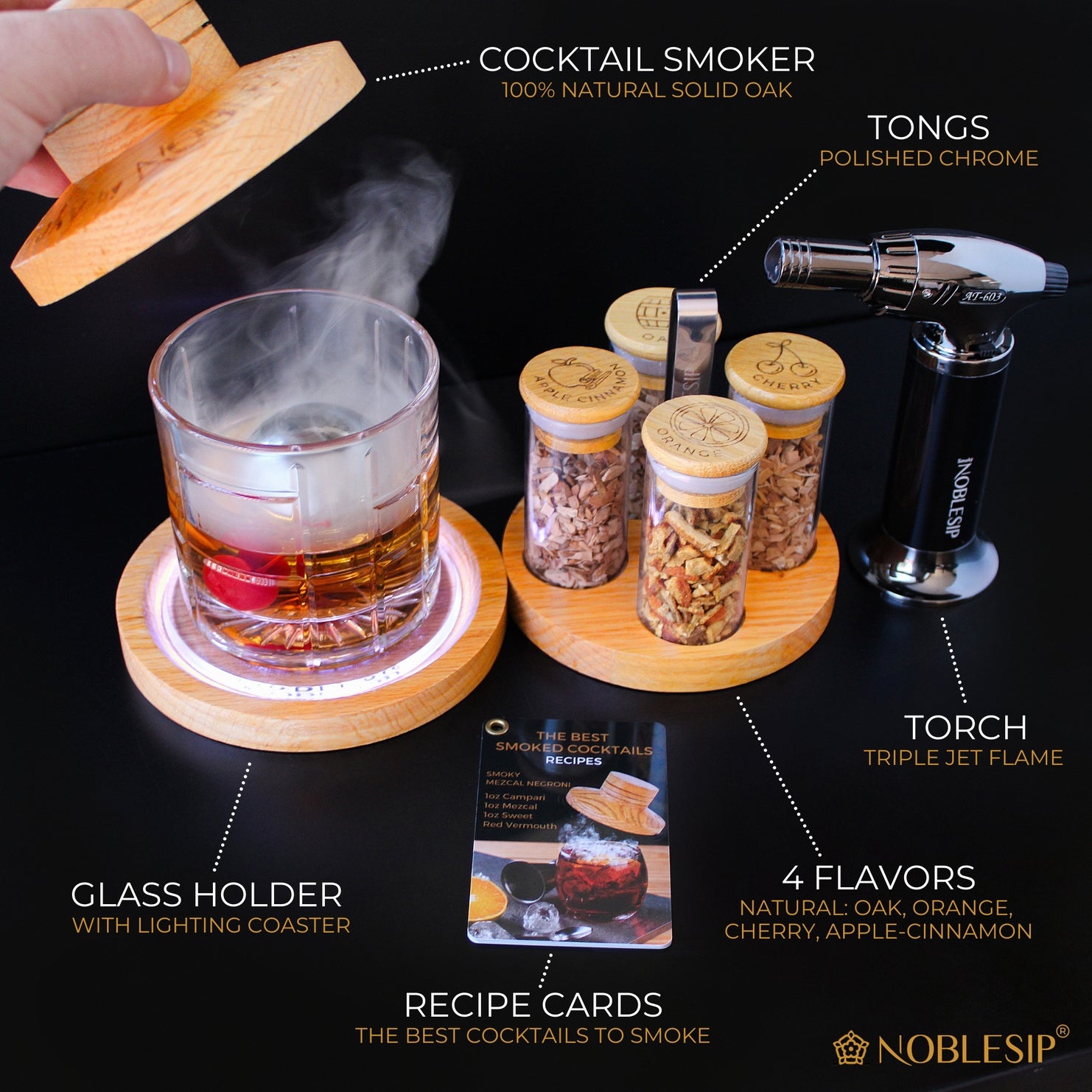 🥃 Use the Selected Wood Chips to enhance your drink flavors. Full Smoker Kit for professionals and home bars. Bar Case: 1 Oak Smoker with lid and stand; 1 Filter; 1 full working Torch; 4 Premium Selected Wood Chips glass jars - OAK CHERRY, APPLE CINNAMON, and ORANGE; Tongs; Recipes Cards with The Best Cocktails to smoke; Individual Product & Donation Certificate.