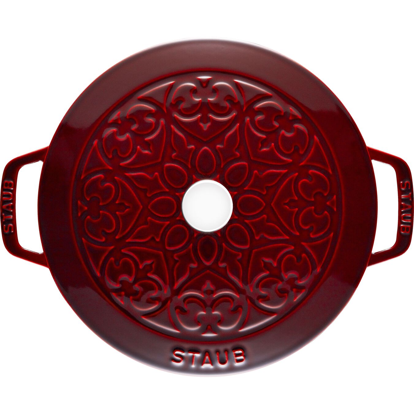 Add an artistic flourish to your cookware collection with the Staub Lily Cocotte that features intricate detailing on the lid accented by Fleur-de-Lis. The 3.75-quart Lily Cocotte has a domed lid perfect for poultry and larger cuts of meat, as well as sloping, tapered sides that are well suited to making risotto, soups and more classic recipes. The self-basting Chistera lid cascades moisture and juices back into food as it cooks, building up wonderful flavor and texture.Made with care in France, the Lily is made with cast iron for even, efficient heating. The multicoat enamel finish resists rust, chipping and cracking, and requires no seasoning. This glossy, vibrant finish gives the oven a stunning appearance reminiscent of fine ceramics—yet it’s durable and dishwasher safe, making it easy to use every day.