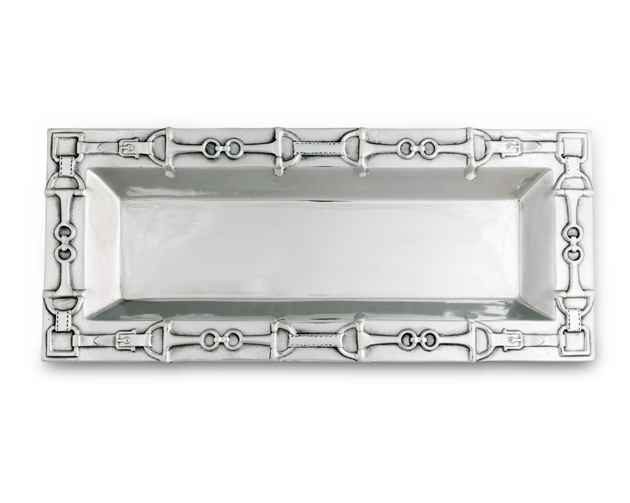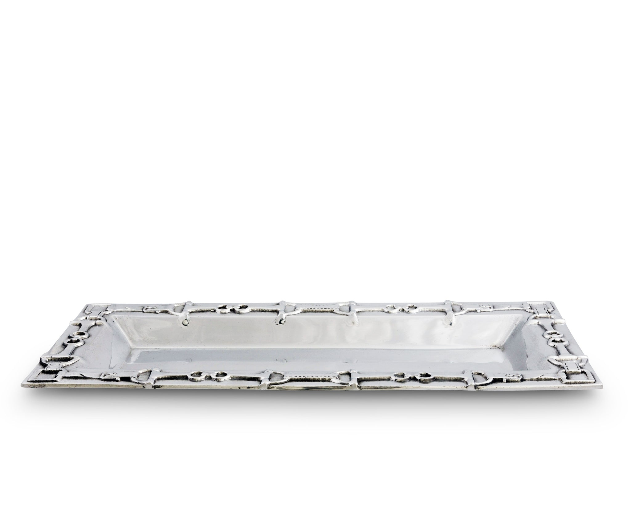 Embellish your serve ware with the signature design of Arthur Court's Equestrian Oblong Tray. Bits link together around the edge of this tray as leathery straps wrap around their rein rings and buckle. Crafted with realistic detail, this pattern looks as though the actual gear was infused into the handmade, aluminum.