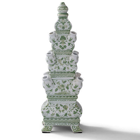 Green Willow is our classic chinoiserie inspired Asian scenic tableau in green and white. The tulipiere is a vase which is designed to hold multiple flowers as it has 12 openings or spouts. Often shown on the dining table or the mantle in a series of pairs, or in multiples for a profusion of color with your flowers.