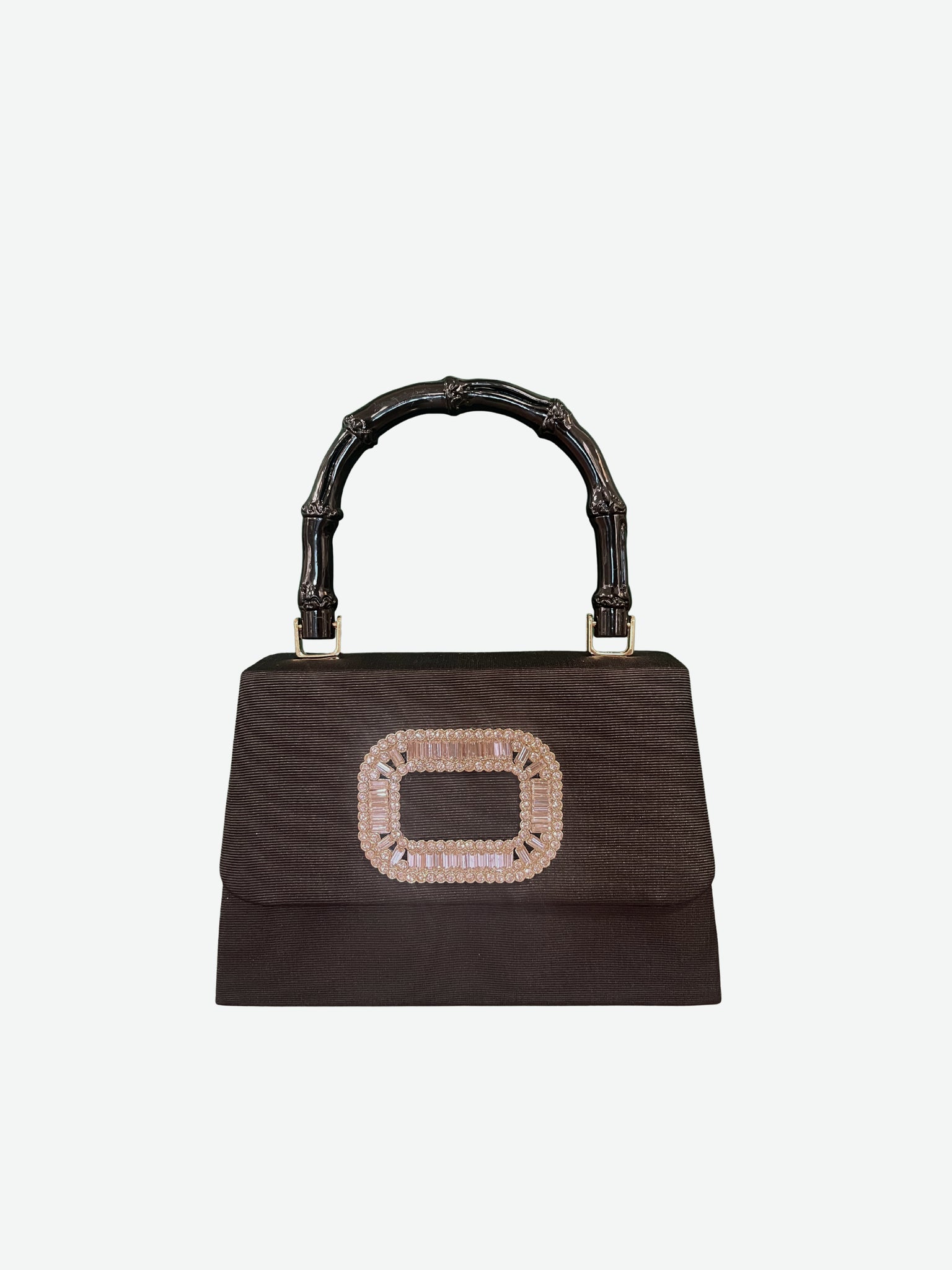 The elegantly small Lulu black faille handbag is perfect for the winter season. With the sheen from the fabric, sparkling rhinestone clasp, and matching bamboo handle, this bag is festive for the Holiday season or any time of year. Stand out at your next special occasion!