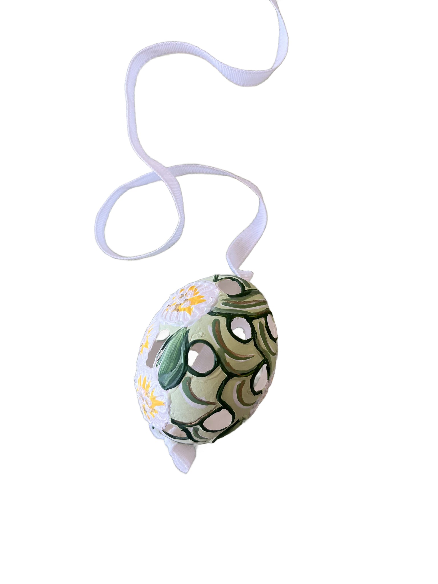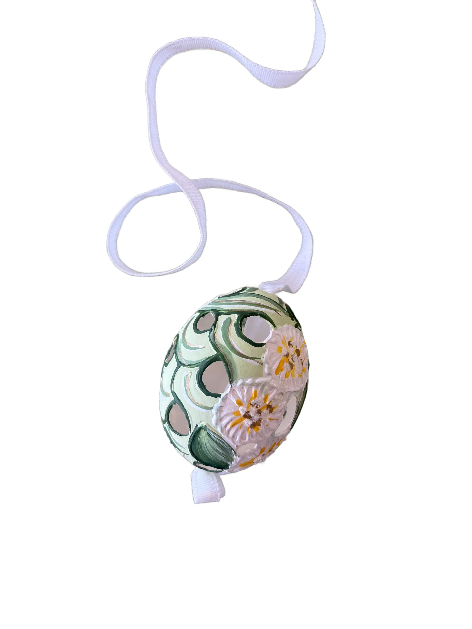 Beautiful hand-decorated blown egg with scalloped cut-out and hand painted floral design.